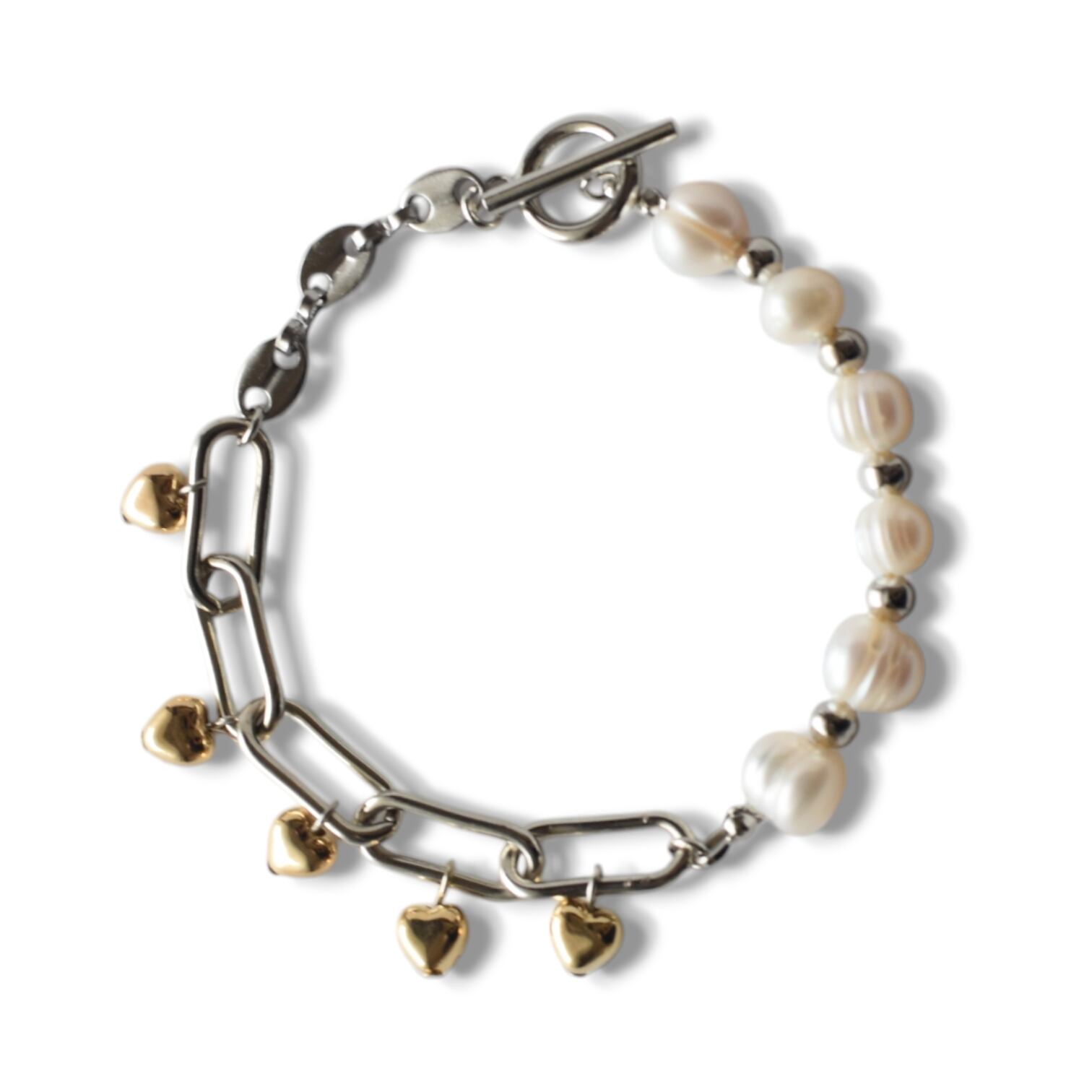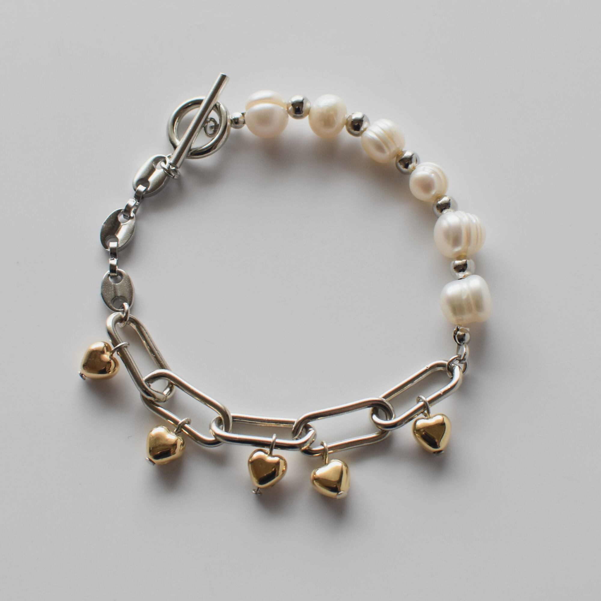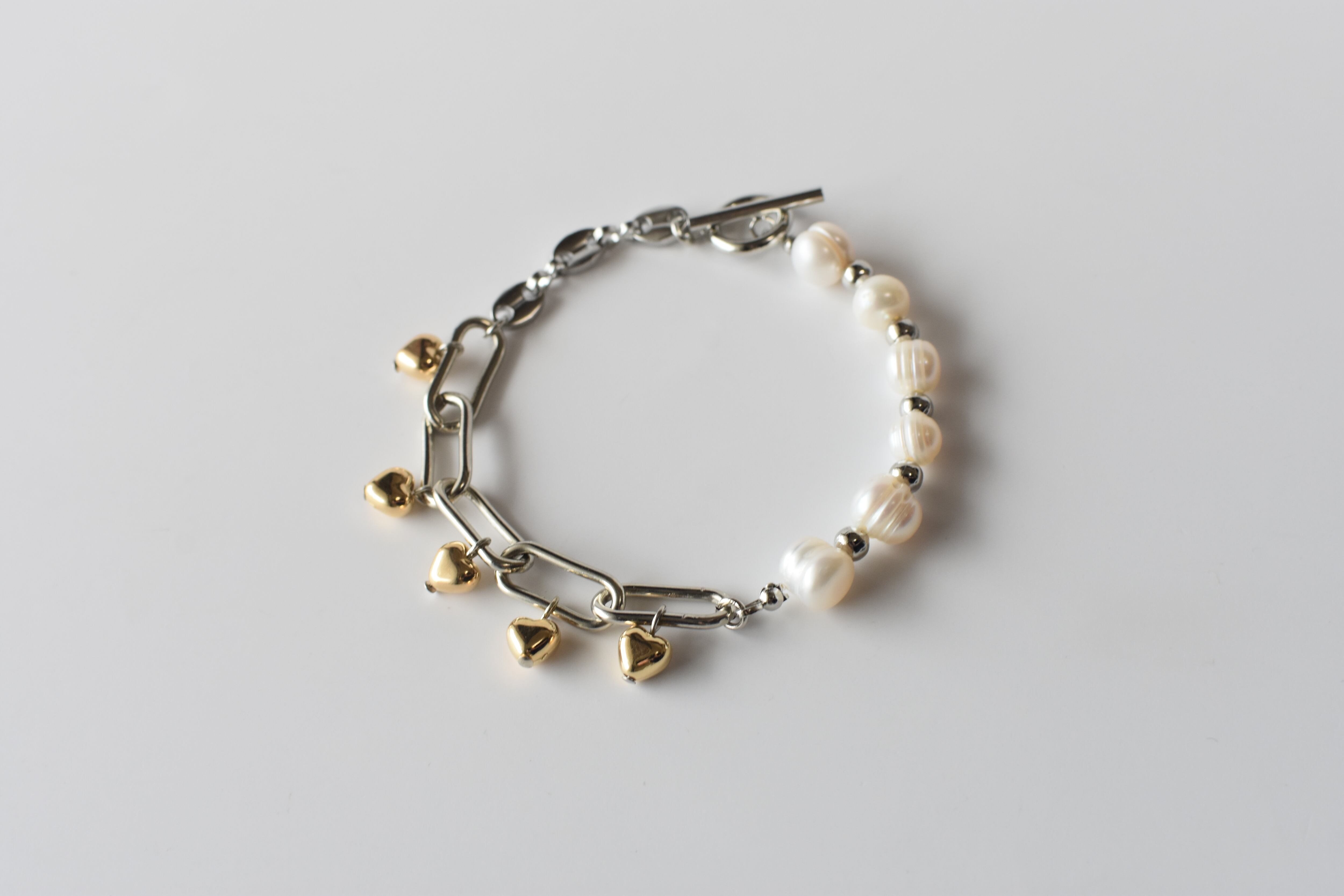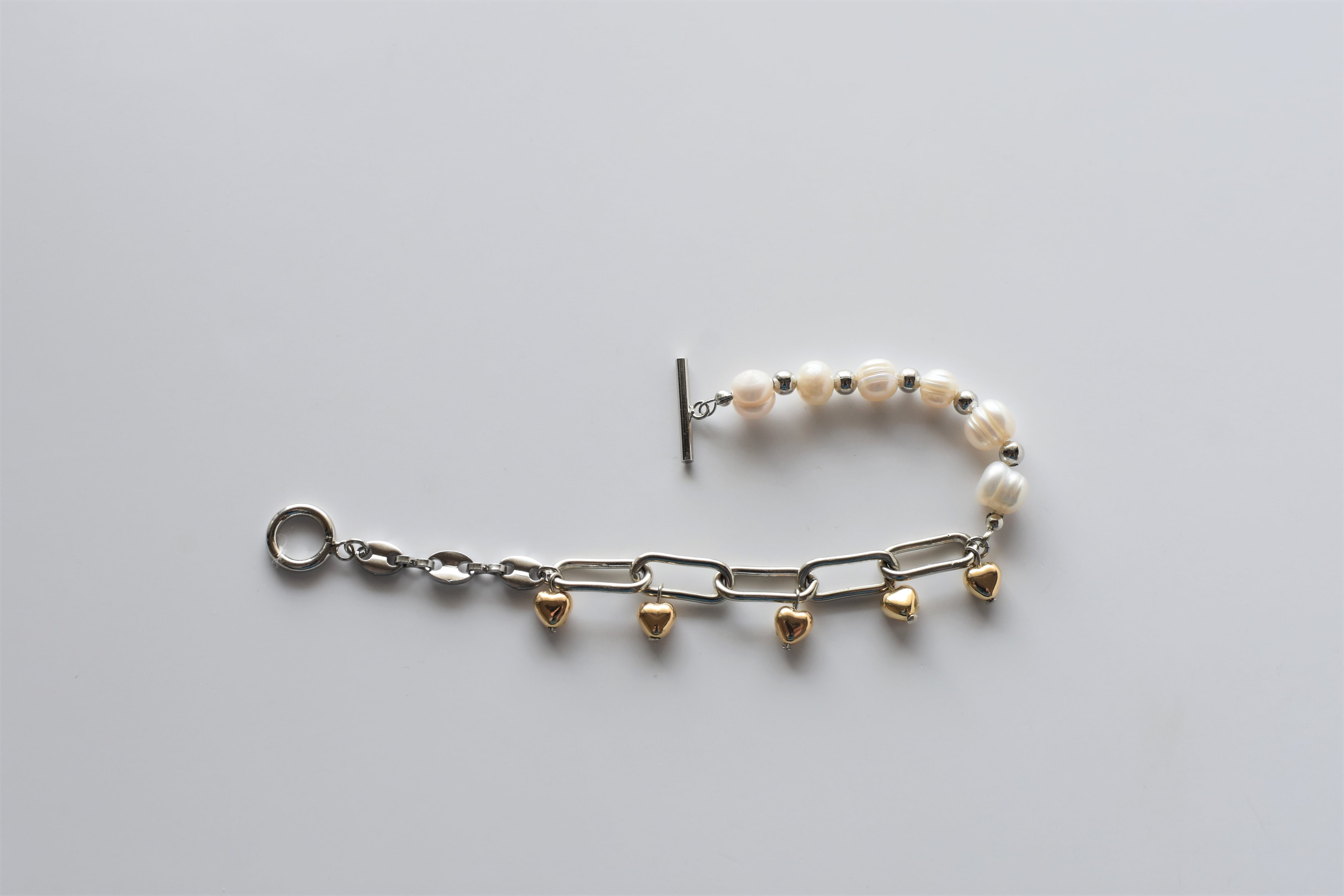 揺れるハートがポイントの、存在感のあるブレスレット。